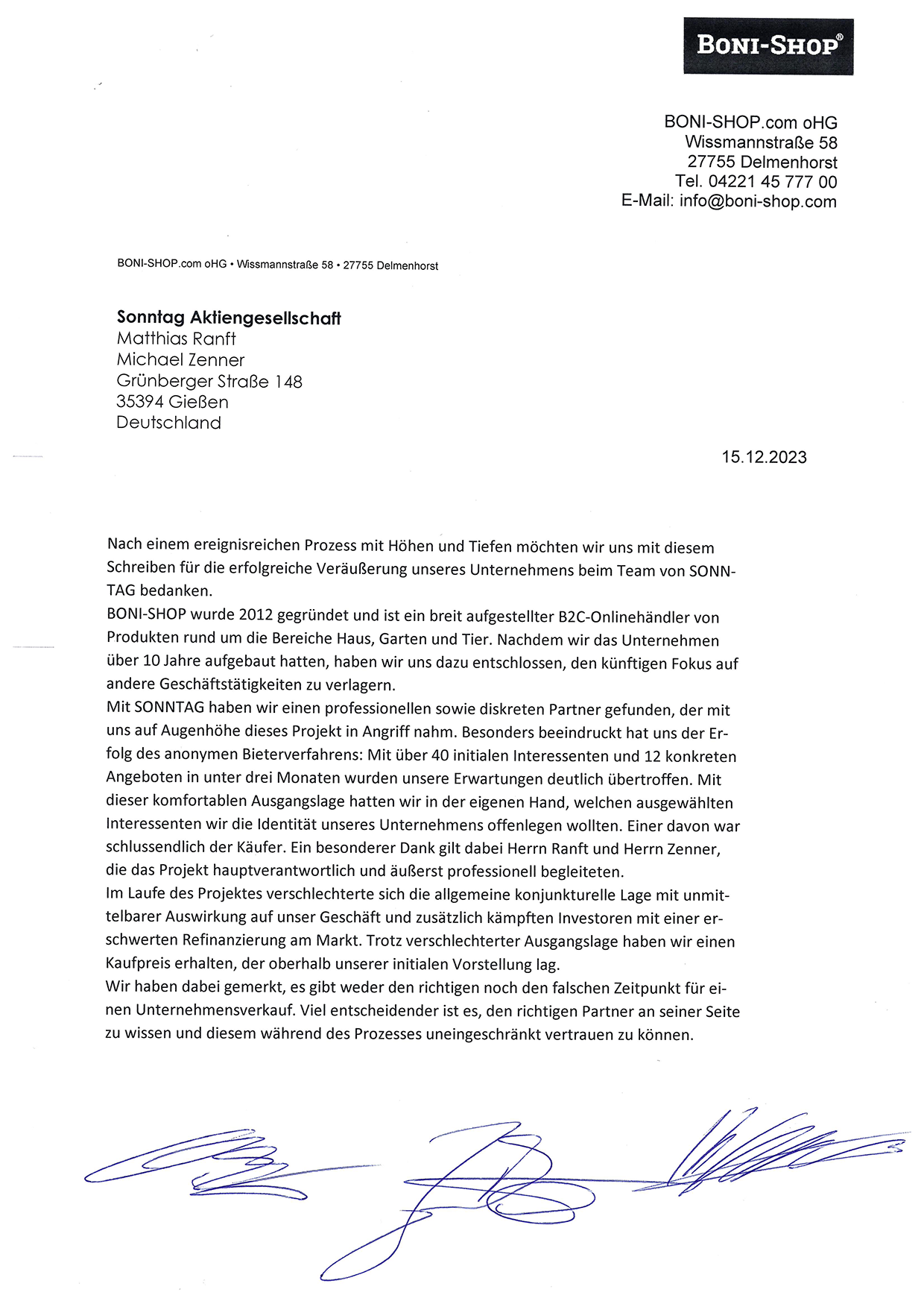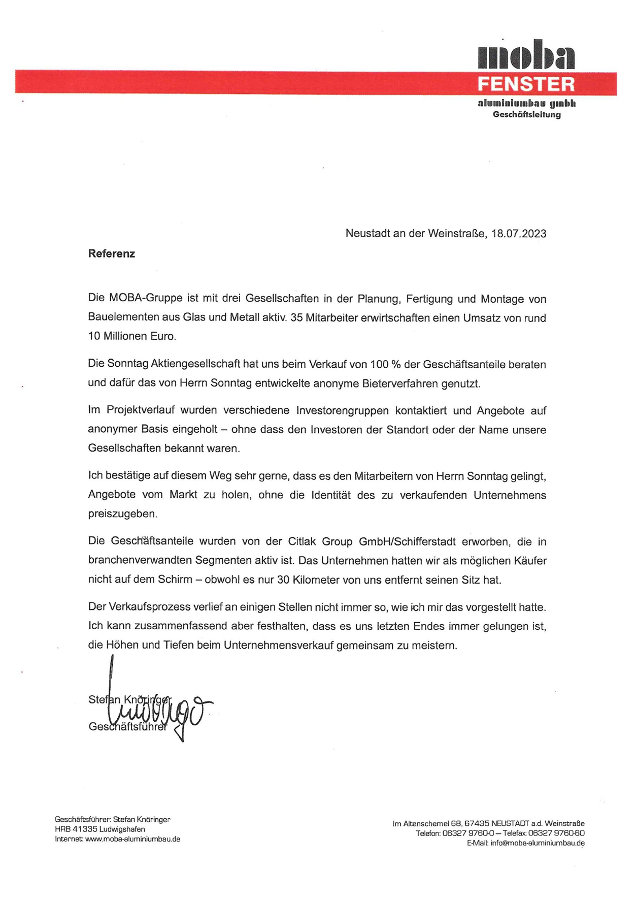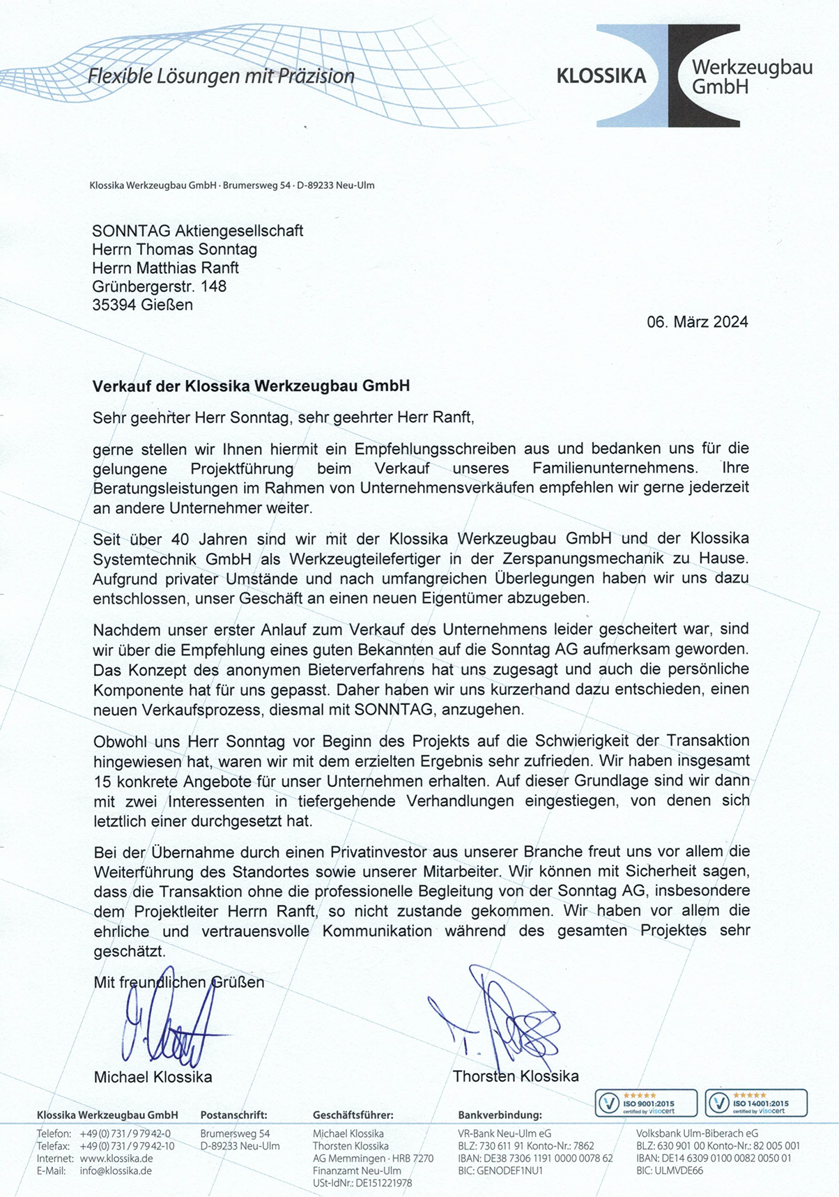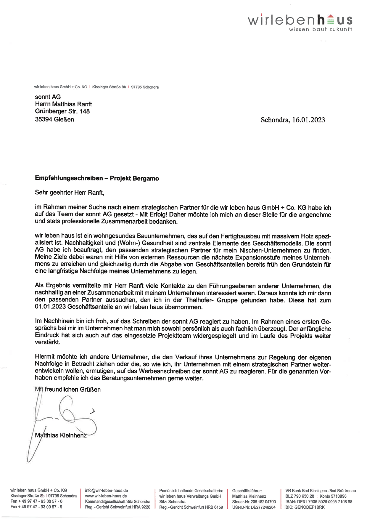 Ich hoffe, dass ich meine Erfahrung, insbesondere in der Zusammenarbeit mit Finanzinvestoren, nutzen kann, um den Verkaufsprozess Ihres Unternehmens aktiv mitzugestalten.